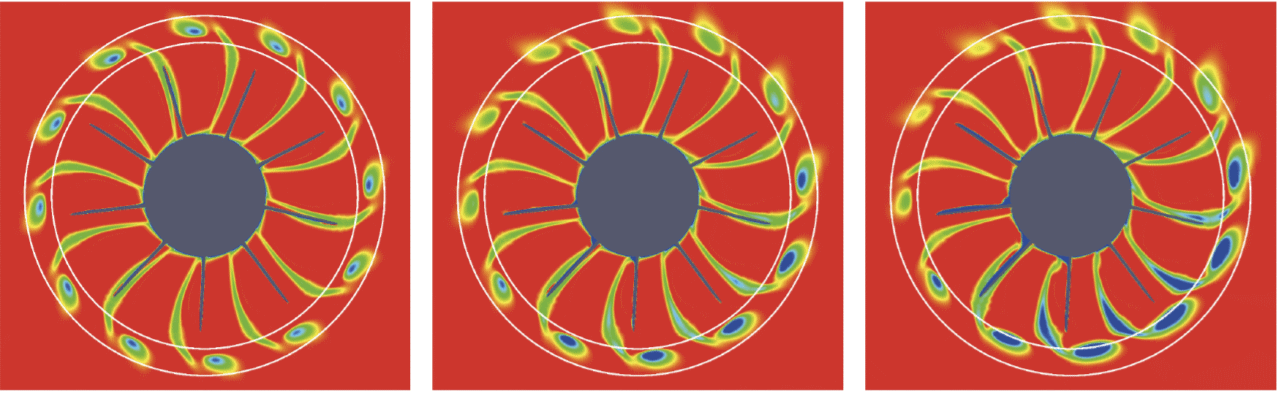 Abstract: In this paper, an unsteady tip leakage flow phenomenon is identified and investigated in a centrifugal compressor with a vaneless diffuser at near-stall conditions. This phenomenon is associated with the inception of a rotating instability in the compressor. The study is based on numerical simulations which are supported by experimental measurements. The study confirms that the unstable flow is primarily driven by the Kelvin-Helmholtz instability inherent in the shear layer between the main-stream flow and the tip leakage flow. The shear layer instability induces large scale vortex shedding which propagates circumferentially, leading to pressure perturbations with short wavelength and high amplitude which rotates at about half of the blade speed. The shed vortex is also found to interact with the main blade leading edge, resulting in the reduction of the blade loading identified in the experiment. The paper also reveals that the downstream volute imposes a long wavelength circumferential non-uniform back pressure at the impeller exit, which is found to either excite or supress the vortex shedding within the blade passage depending on the relative circumferential position of the impeller and the volutes.