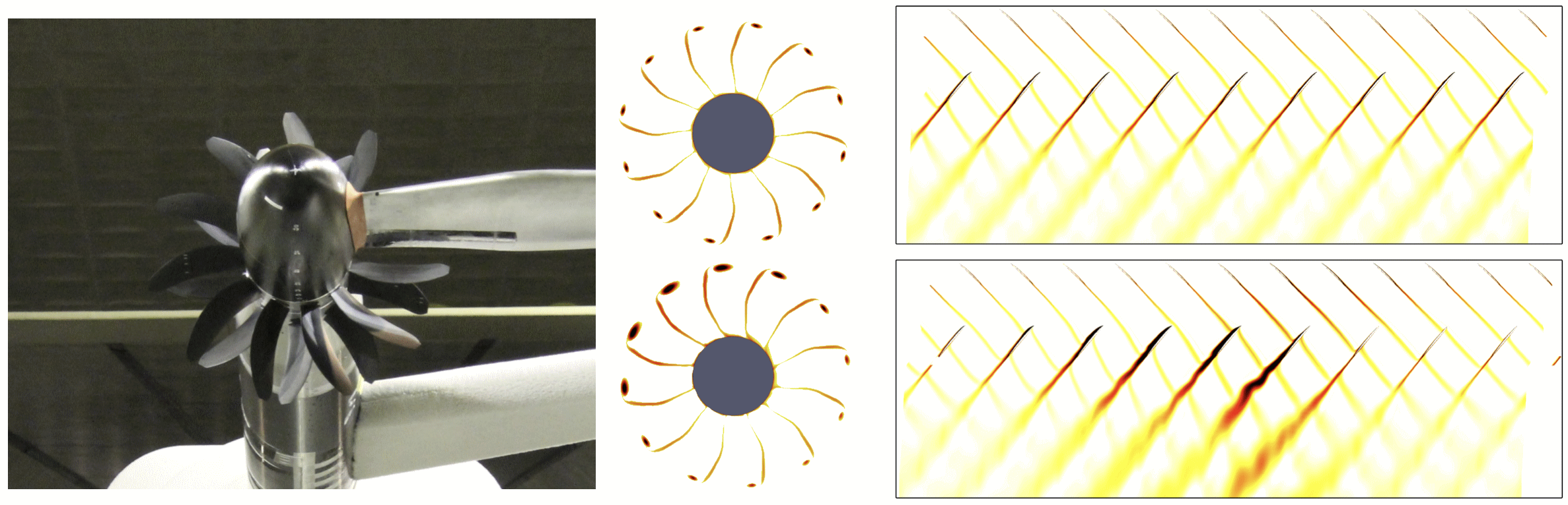 Abstract: A key challenge in open rotor design is getting the optimum aerodynamics at both the cruise and take-off conditions. This is particularly difficult because the operation and the requirements of an open rotor are very different at cruise compared to takeoff. This paper uses CFD results to explore the impact of various design changes on the cruise and take-off flow-fields. The paper then considers how a given open rotor design is best operated at take-off to minimise noise whilst maintaining high thrust. The main findings are that various design modifications can be applied to control the flow features that lead to lost efficiency at cruise and increased noise emission at take-off.